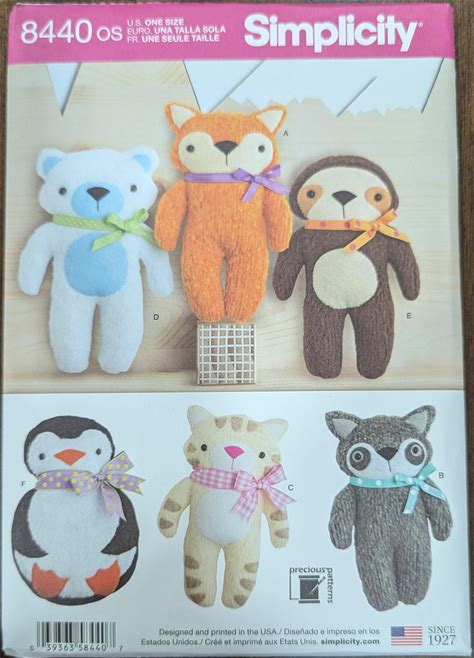 Uncut Simplicity Sewing Pattern 8440 For Stuffed Animals. Fox, Raccoon, Cat, Bear Sloth And Penguin. One Size.
